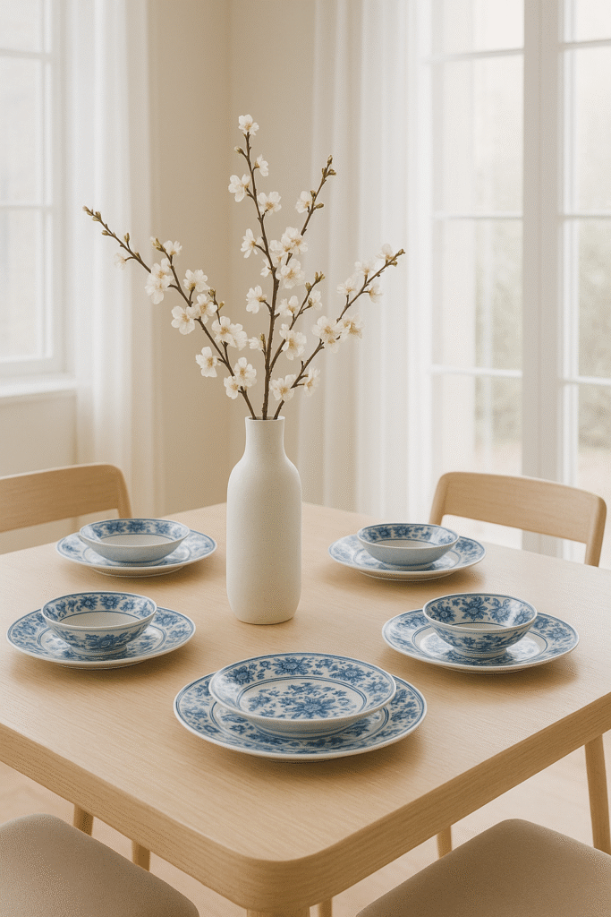 Elevate your dining experience by setting the table with Chinese porcelain plates, bowls, and serving dishes. Mixing contemporary flatware and glassware with classic porcelain creates a sophisticated visual. Choose a centerpiece vase filled with fresh flowers or seasonal greenery to tie everything together.