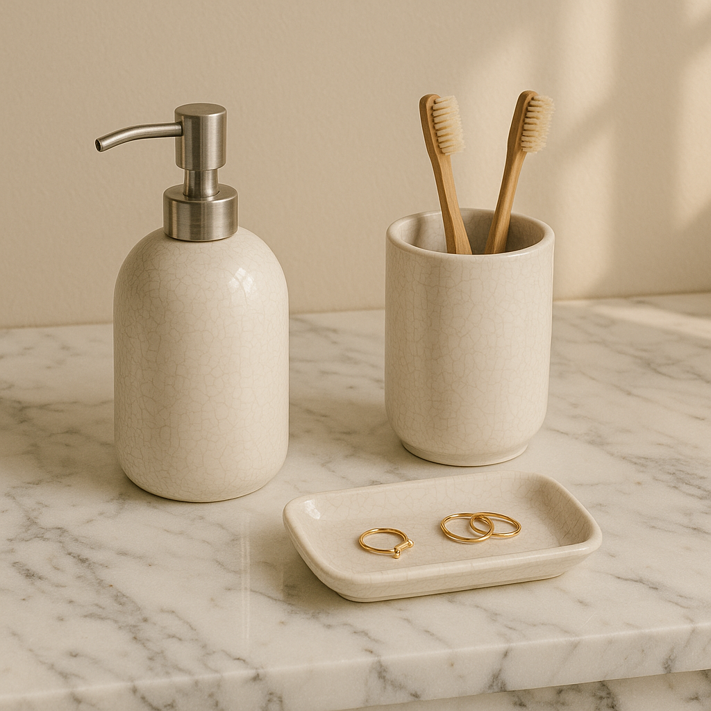Don’t overlook smaller spaces! A bathroom vanity can become a refined retreat when styled with porcelain soap dispensers, toothbrush holders, and small dishes for jewelry. Choose pieces with subtle crackle glazes or minimalist silhouettes. These accents add a spa-like luxury feel without overpowering sleek, modern fixtures.