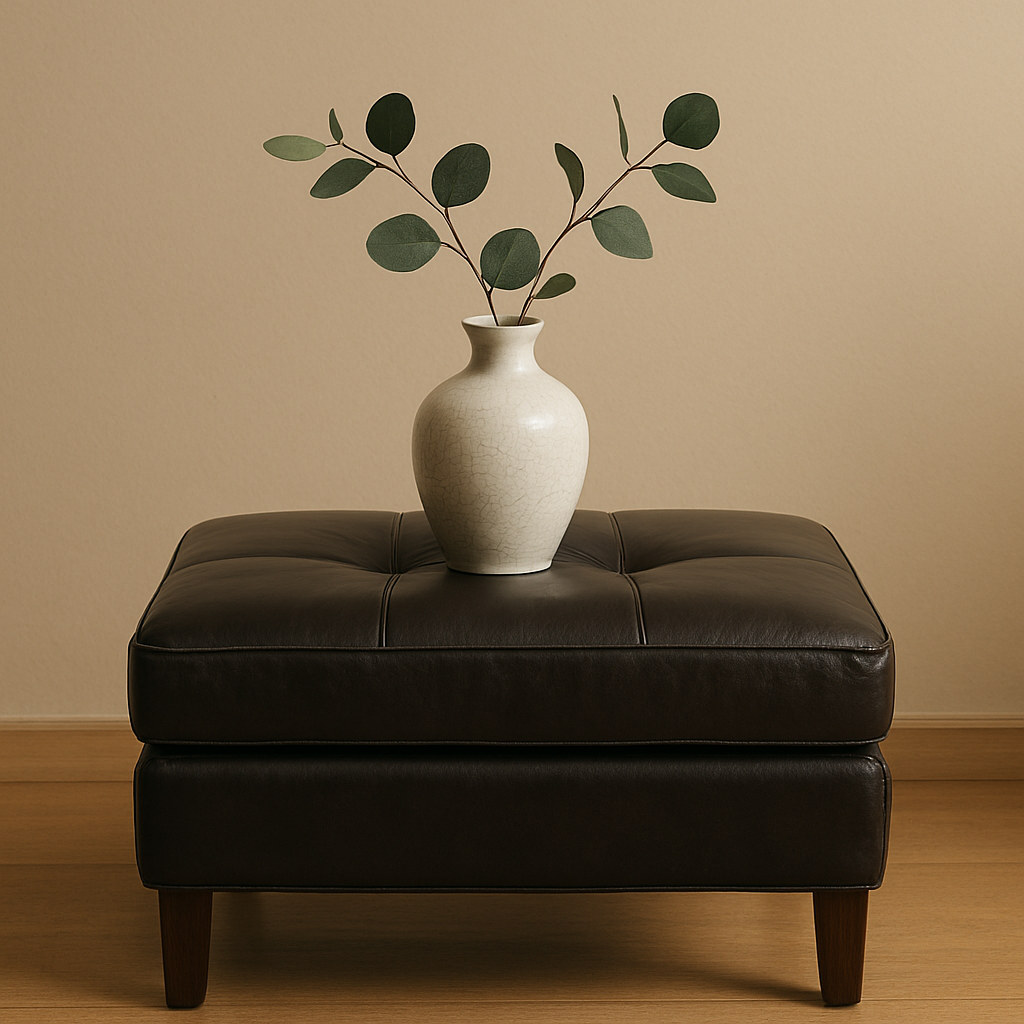 9. Mix Texture by Placing a Crackle-Glaze Porcelain Vase on a Leather Ottoman