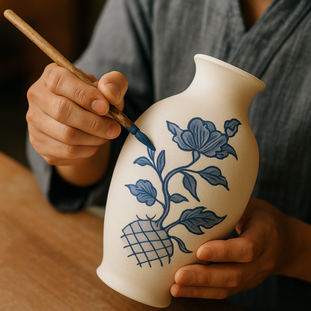 Underglaze painting is the technique of applying pigment (usually cobalt blue) directly onto the unfired porcelain body. Once the design is complete, a transparent glaze is applied, and the piece is fired at temperatures over 1300°C.
